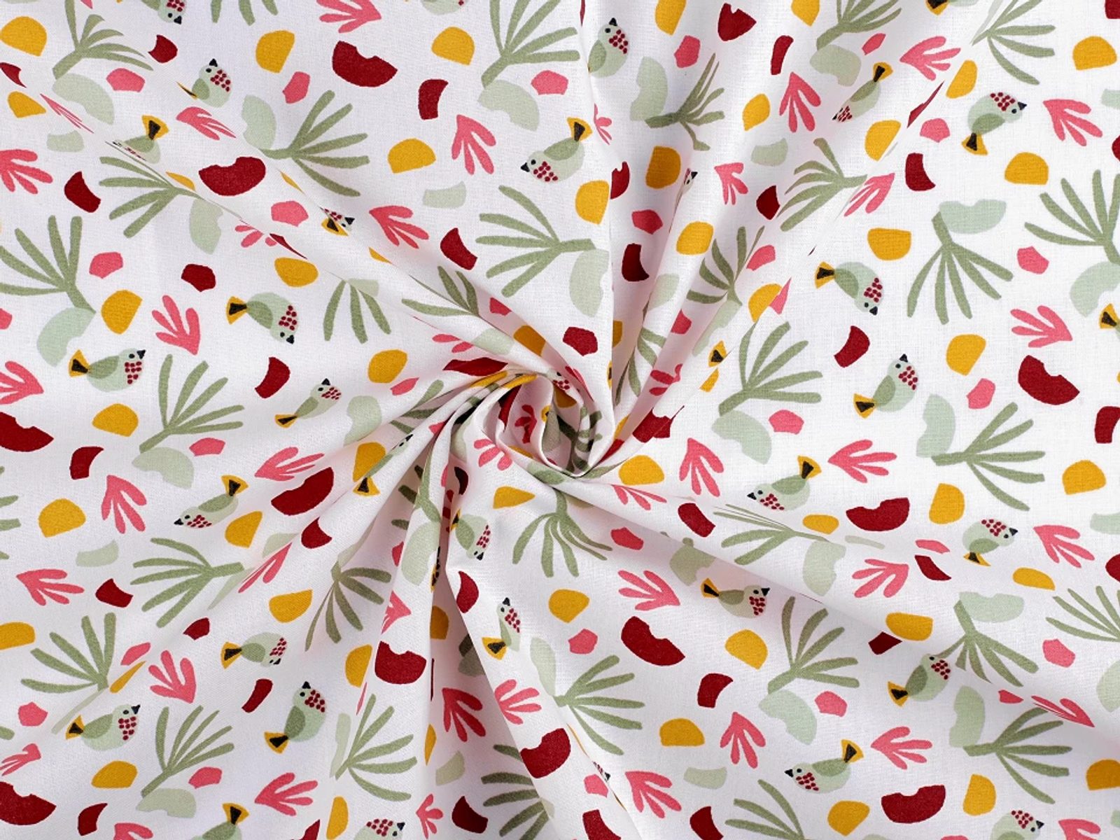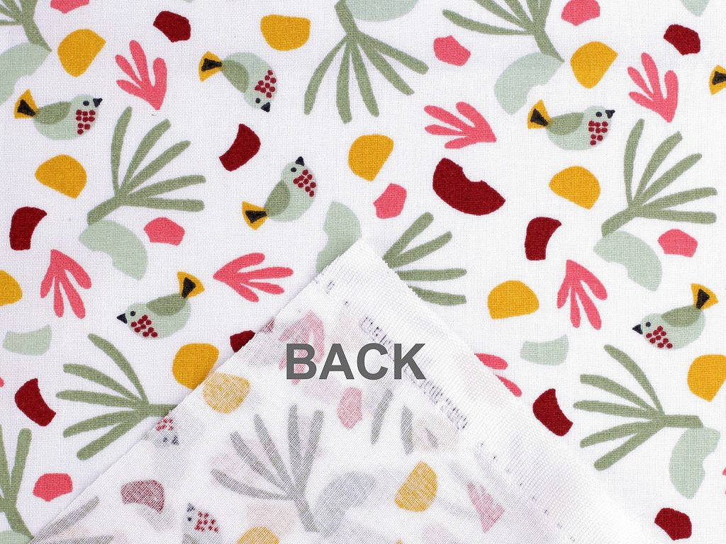 Bavlněnou látku s designem malých ptáčků a rostlin využijete na šití polštářů, povlečení, závěsů, mantinelů do postýlek i hnízd pro děti. Je vhodná také na šití tašek, ubrusů apod.