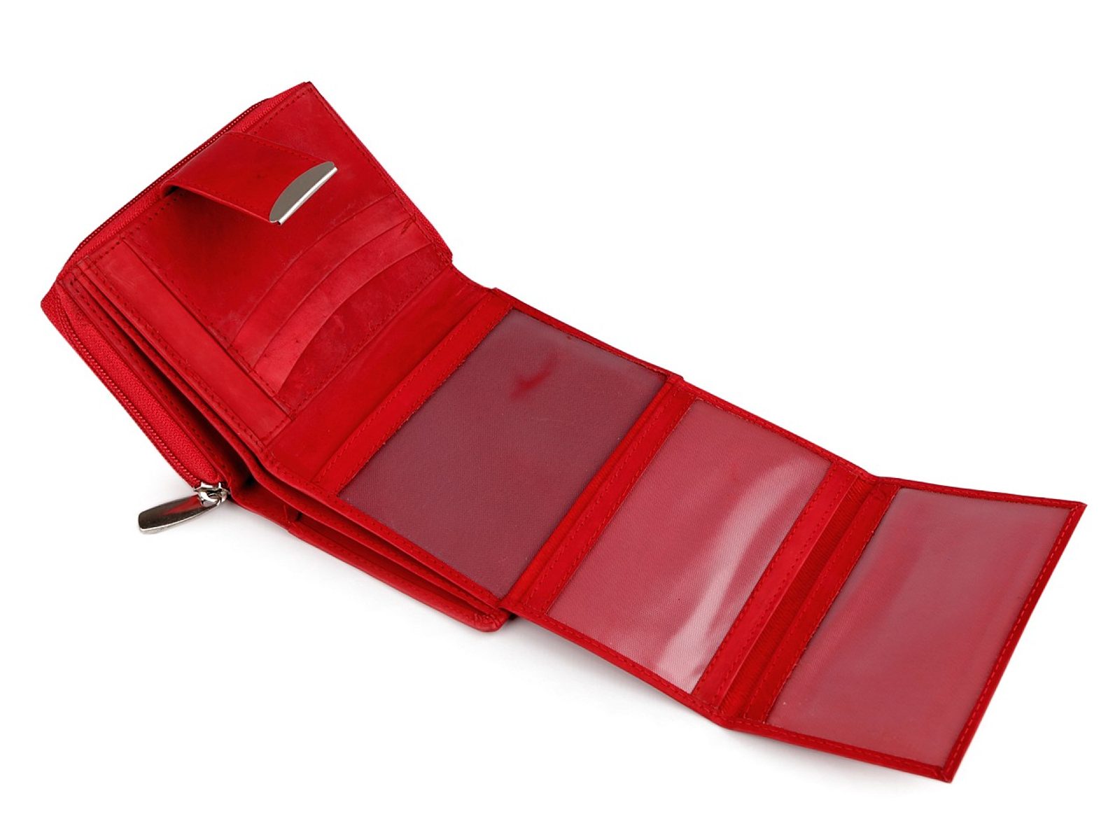 Přední část peněženky se uzavírá na zápinku na patent. Uvnitř je 14 přihrádek na kreditní karty, z toho jsou 3 průhledné, na doklady. Za nimi se nachází 2 dlouhé přihrádky na bankovky. V zadní části peněženky je samostatně umístěný mincovník. Uzavírá se na zip, uvnitř má 2 přihrádky oddělené přepážkou. V přepážce je poslední malá kapsička na zip.