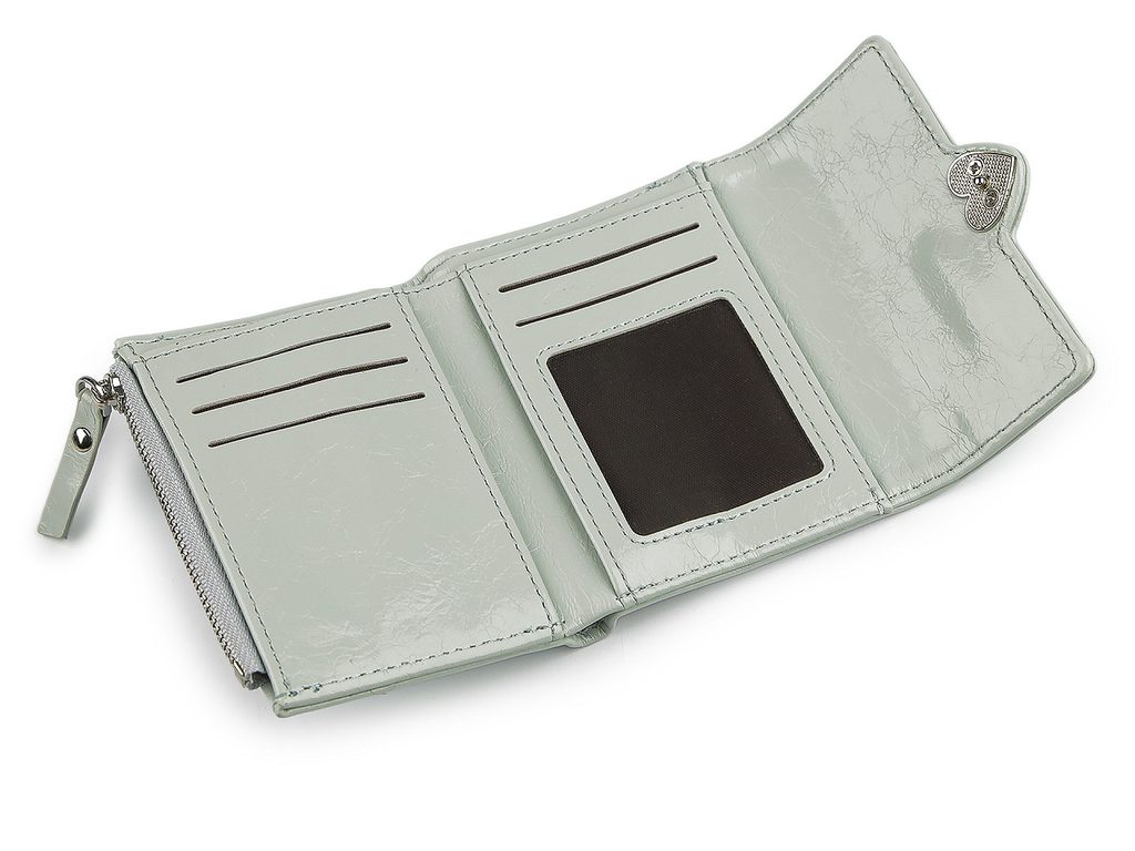 Po otevření klopy, která se uzavírá na patent, se objeví oddíl na kreditní karty, vizitky a velká zadní kapsa na bankovky. Jedna přihrádka je průhledná. Na levé straně je umístěná kapsa na zip na drobné mince.