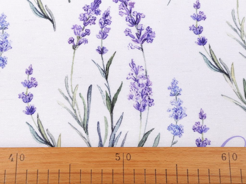 Dekorační látka s levandulemi je vhodná k šití ubrusů, povlaků na polštáře, závěsů, tašek a různých bytových dekorací.
