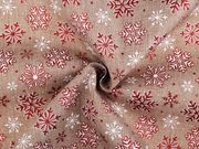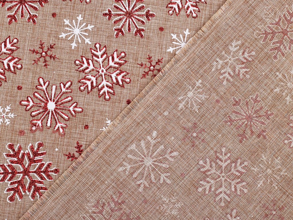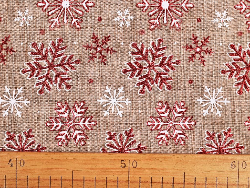 Imitaci juty zdobí glitrový potisk se sněhovými vločkami. Využijete ji především k dekoračním účelům - na šití pytlíčků, ubrusů, prostírání nebo běhounů či ke zdobení truhlíků, květináčů apod.