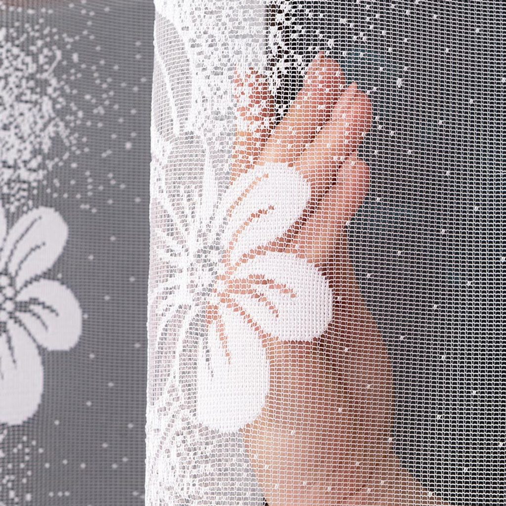 Záclona se hodí do kuchyní, obývacích pokojů či ložnic. Záclona má na vrchní části pevný okraj, který stačí pouze nažabkovat.