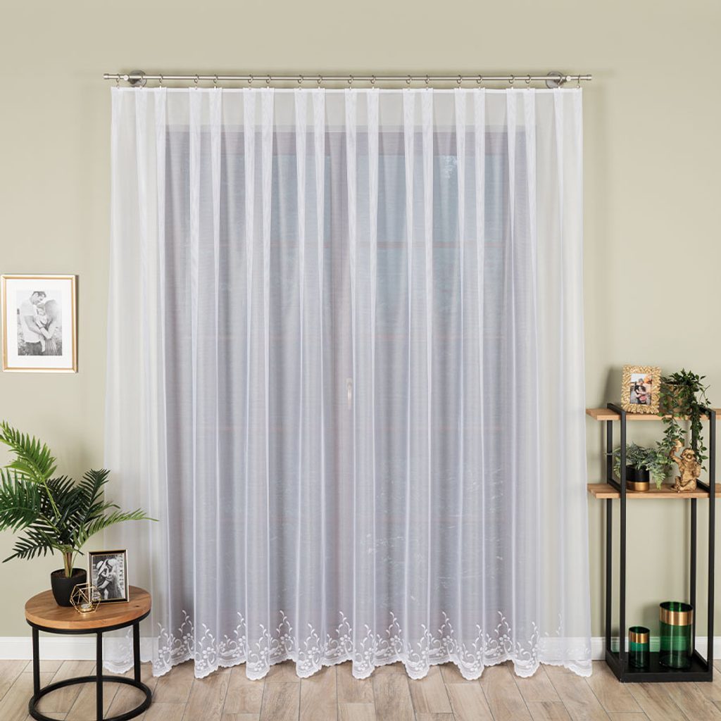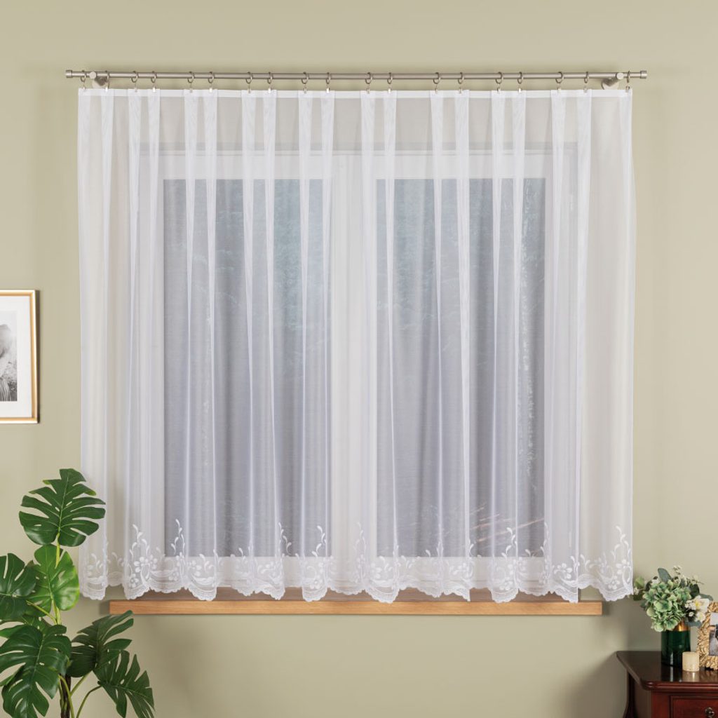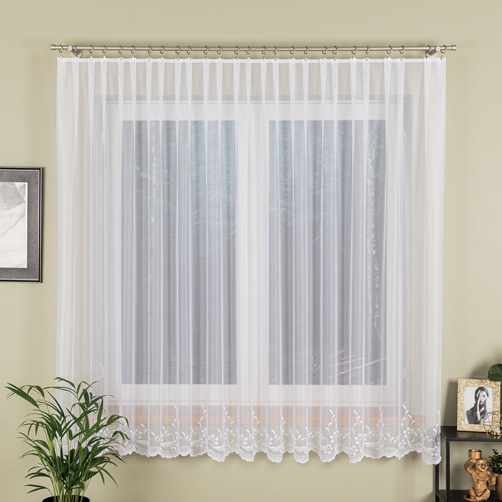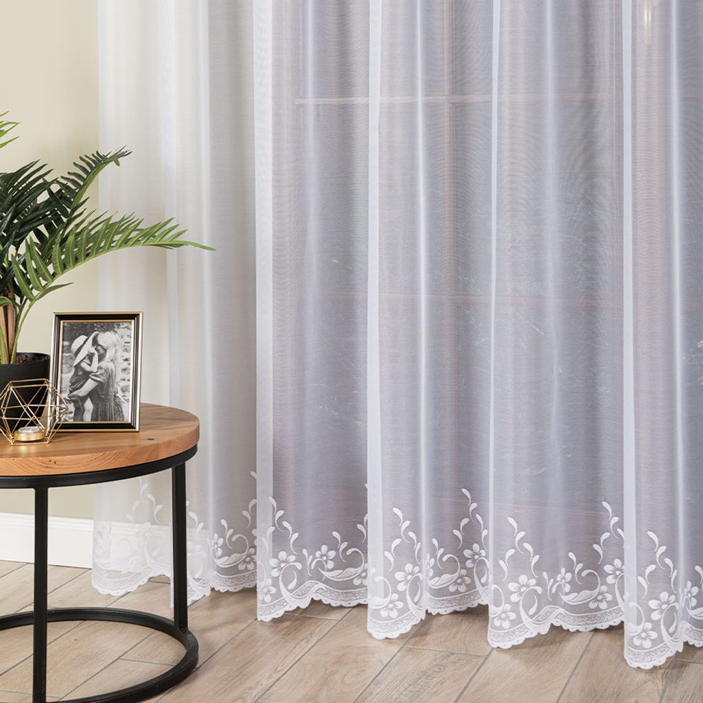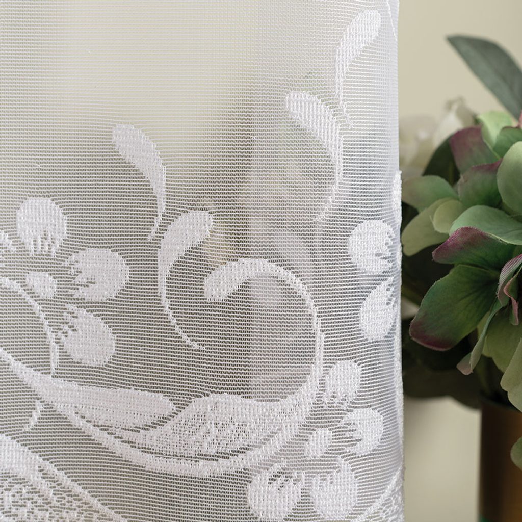 Kusová žakárová záclona s jemným floristickým vzorem. Záclona má jednoduchý floristický vzor na spodní části, zbytek záclony je hladký bez vzoru.