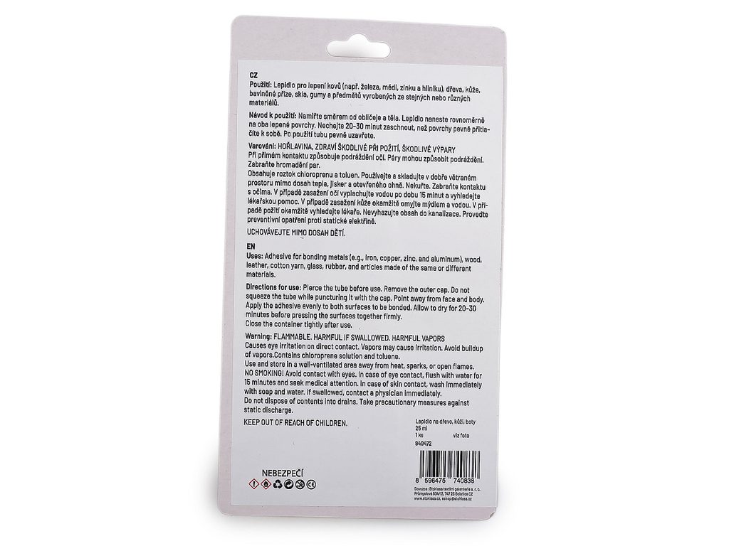 Návod k použití: naneste lepidlo rovnoměrně na oba povrchy. Nechejte ho 20 - 30 minut zaschnout, než povrchy pevně přitlačíte k sobě. Po použití nezapomeňte tubu uzavřít.