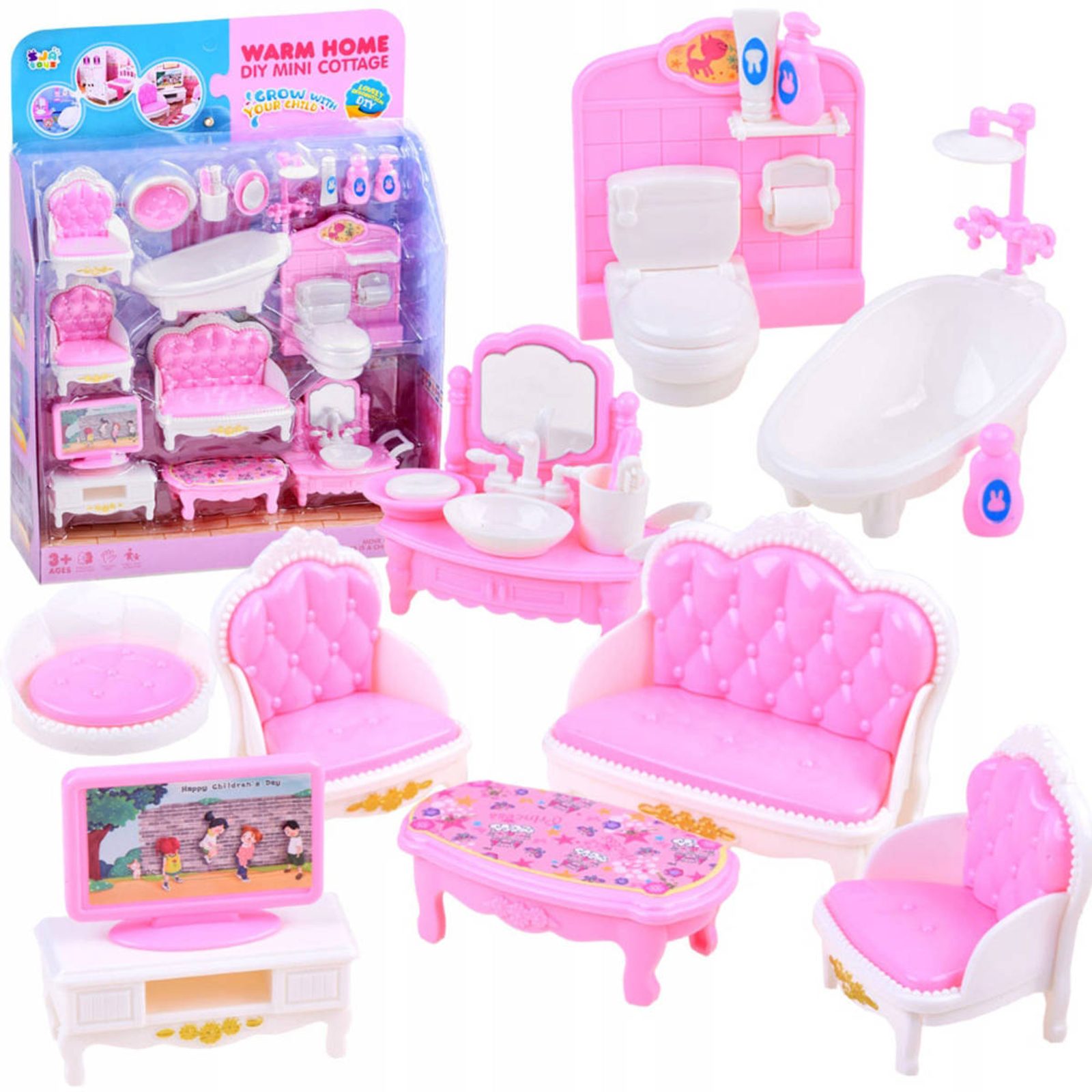 Nábytek růžovobílý doplněk do domečku pro panenky set 15ks plast