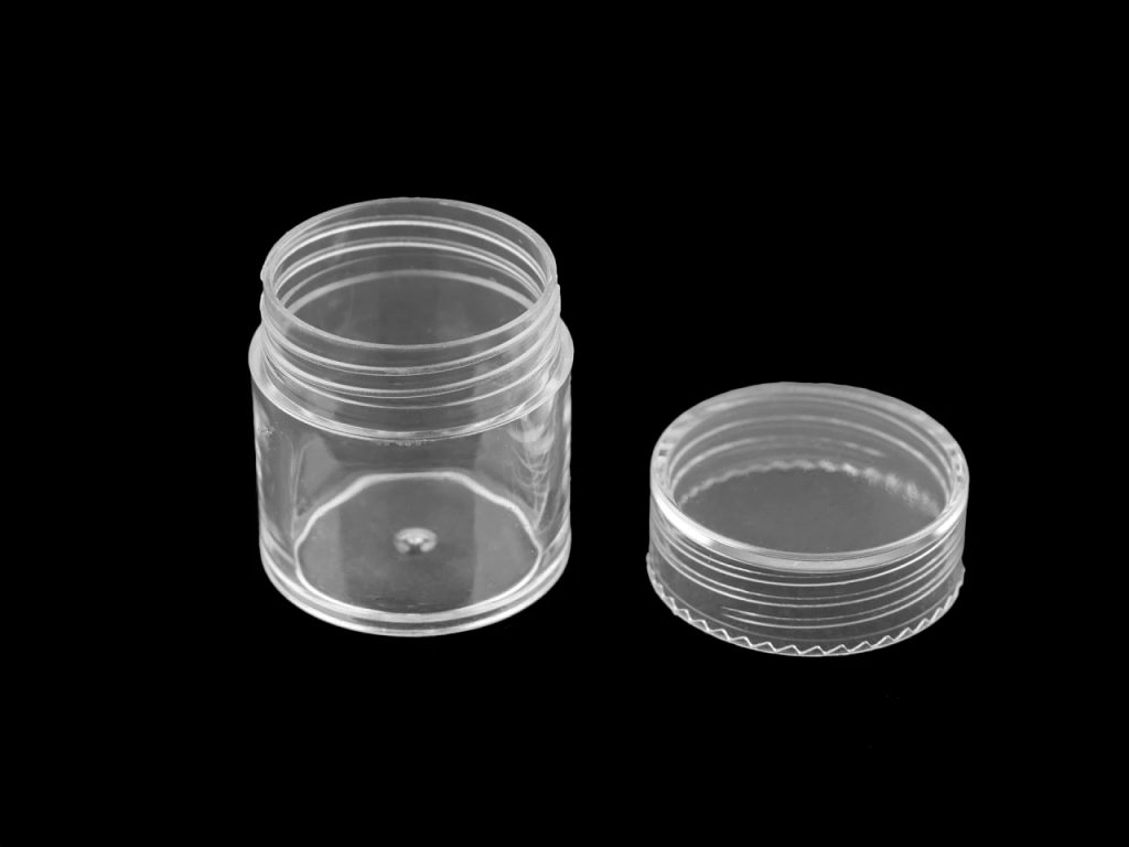 Malou dózičku se šroubovacím víčkem využijete na uložení drobných kreativních potřeb, např. korálků, glitrů, hot-fixů apod. Je transparentní, dovnitř je perfektně vidět.