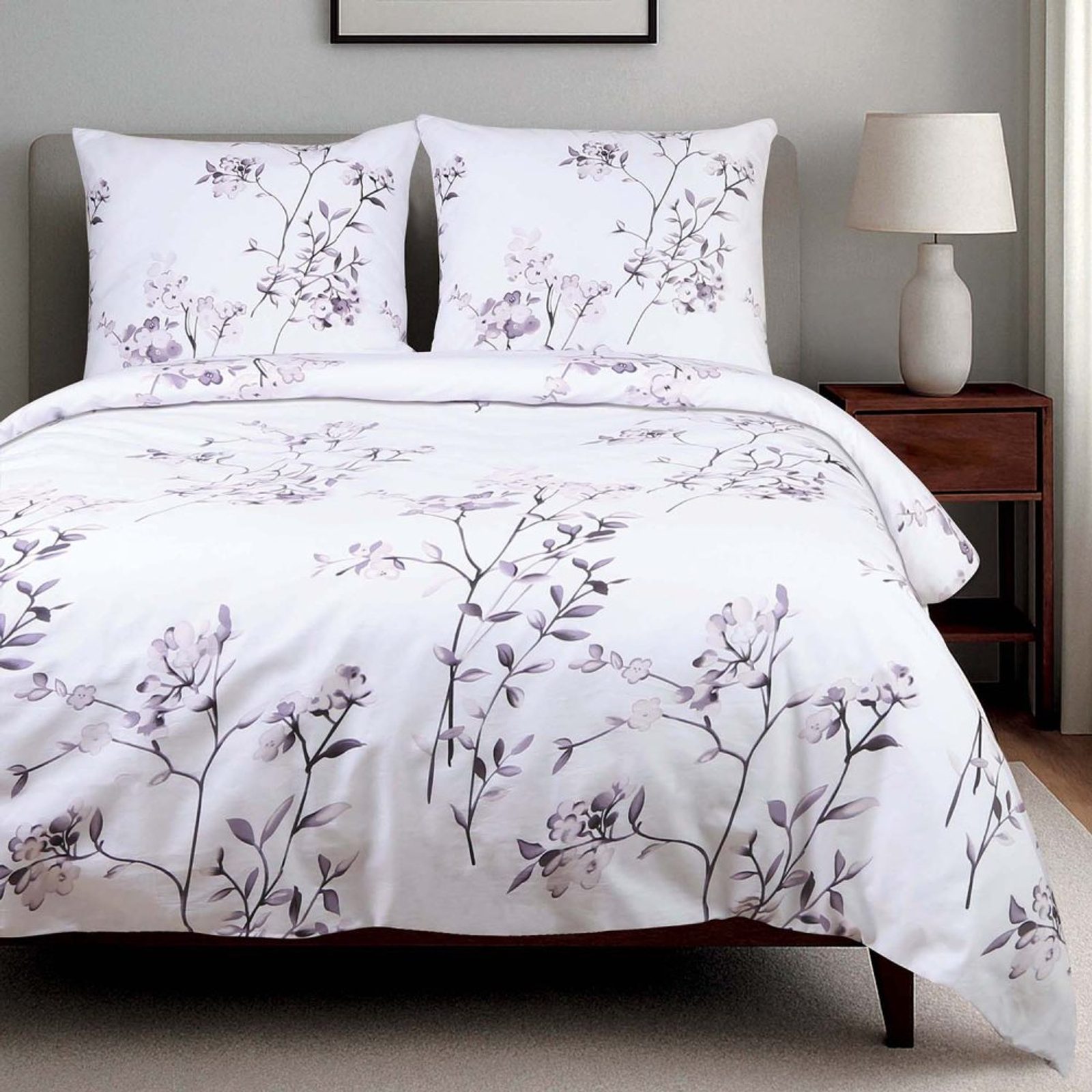 Tkanina v mimořádně vysoké kvalitě se vyznačuje hebkostí a hladkým povrchem. Elegantní floristický motiv kytiček a větviček na bílo-fialkovém podkladu působí svěže a vkusně. Povlečení je vybaveno praktickým zipovým uzávěrem, který doporučujeme před praním uzavřít pro zachování jeho dokonalého vzhledu.
