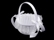 Saténový svatební košíček je jako třešnička na dortu pro všechny družičky. Uvnitř se budou vyjímat plátky růží nebo květinové aranžmá. Košíček je vyrobený z pevnějšího plastu. Zdobí ho mašličky ze saténové stuhy, broušené kamínky a krajka.