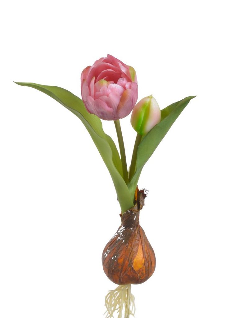 Tulipán s poupětem, listy a cibulkou v barvě růžové.